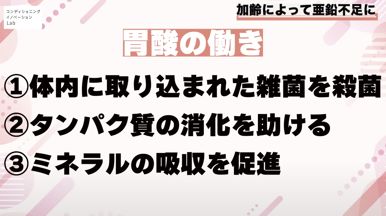消化と吸収では「胃酸」が大事になります。胃酸には「外から入ってくる雑菌を殺す」「タンパクを分解・吸収する」「亜鉛のようなミネラルを吸収する」という重要な働きがあります。
