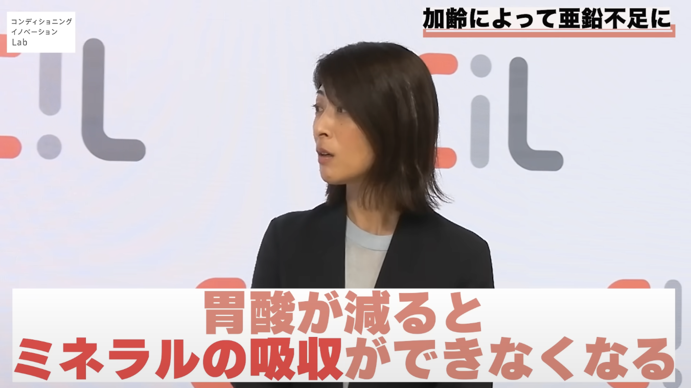 しかし、加齢とともに胃から分泌される胃酸の量や濃度が減ります。そうすると、ミネラルの吸収ができなくなる。その代表的なケースが亜鉛なんですね。