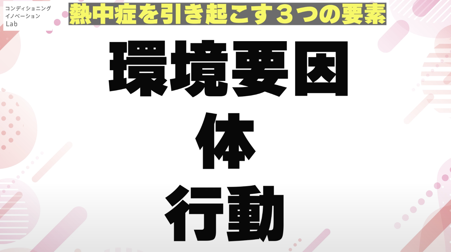 たとえば「持病があるのに無理をする(体の要素)」「睡眠不足が続いている(行動の要素)」など、体や行動に影響があることを続けていて熱い環境(環境要因の要素)が来るとダメージを受けるわけですね。