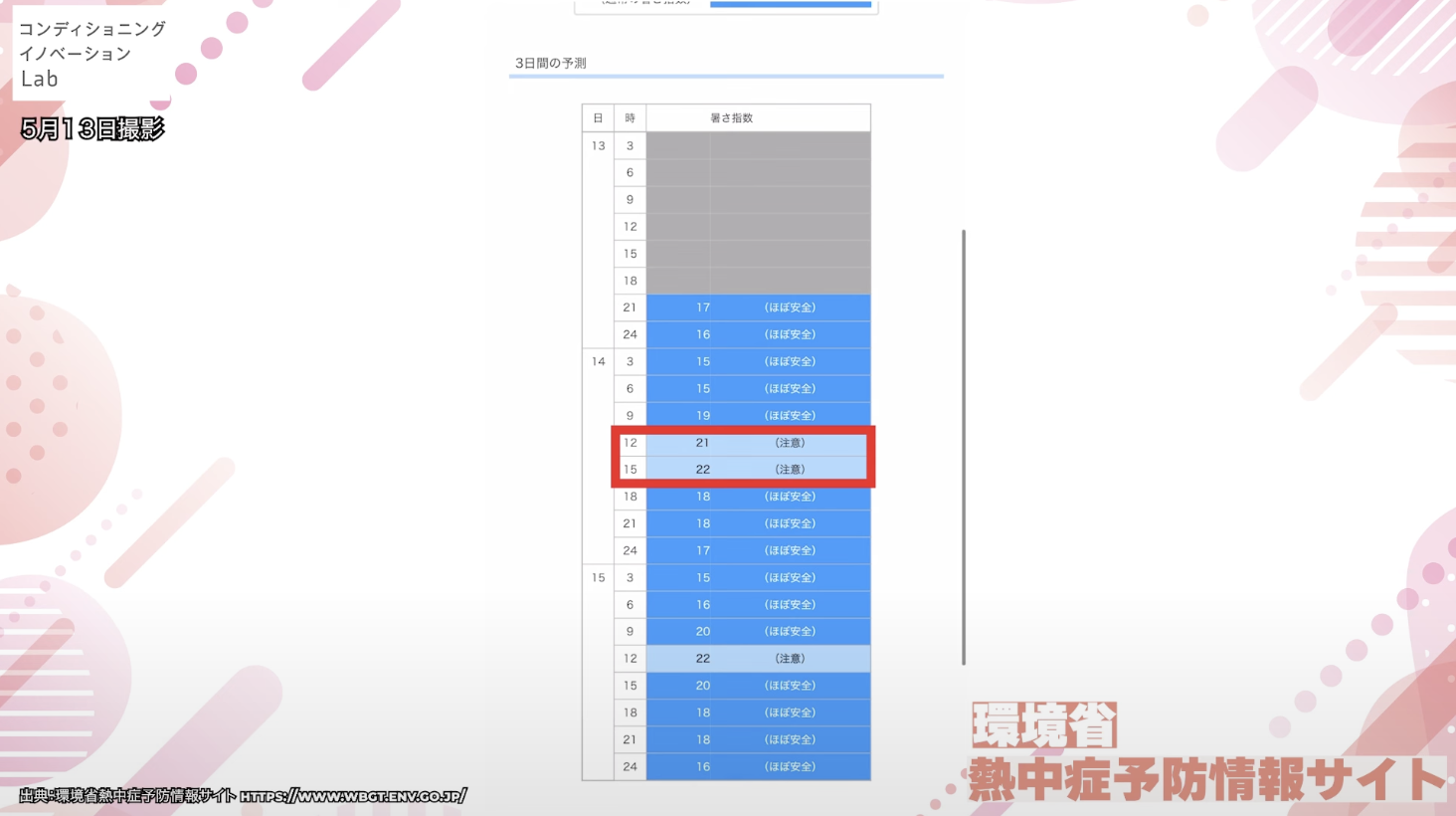 杉田さん)環境省の「熱中症予防情報サイト」で、県や市を絞り込んで指定すると、3時間ごとの数字が出てきます。