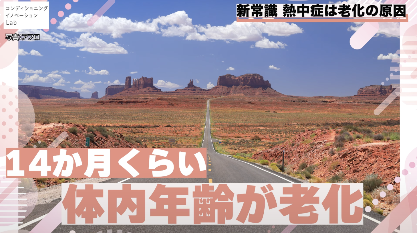 アメリカの研究で、その地域に住んでいる人と、年間に10日〜2週間ぐらいしか猛暑日がない地域の人たちを比べたところ、アリゾナの地域に住んでいる人のほうが14か月ぐらい体内年齢が老化しているというデータが出ているんですね。