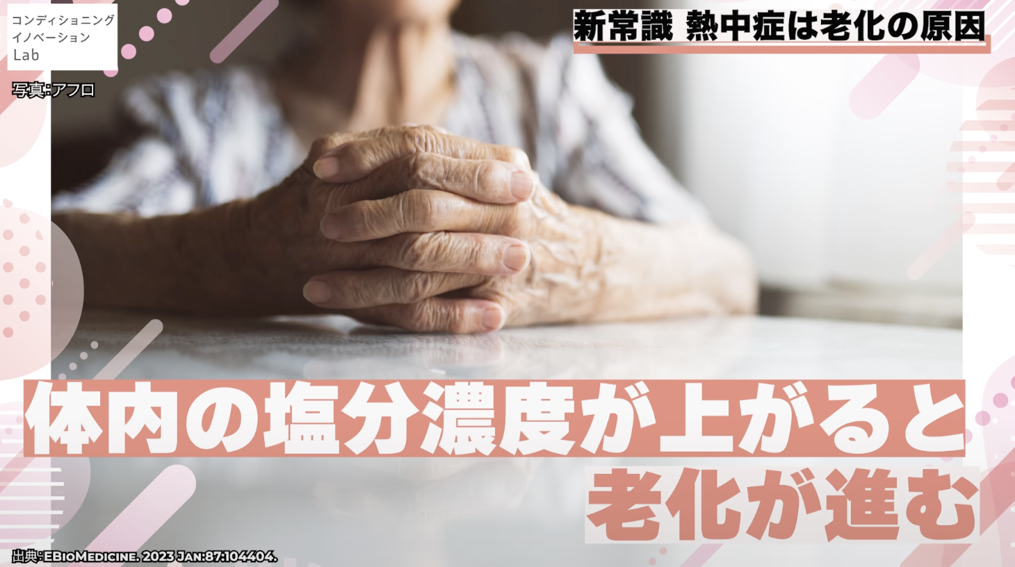 西沢さん)水をとらないでいると体内の塩分濃度が上がるんですが、これも老化を進める因子であることがわかってきたんですね。それも、異常値ではなくて正常値の方でも、慢性疾患のリスクが高まったり老化が進んでいたりといった兆候が見られます。