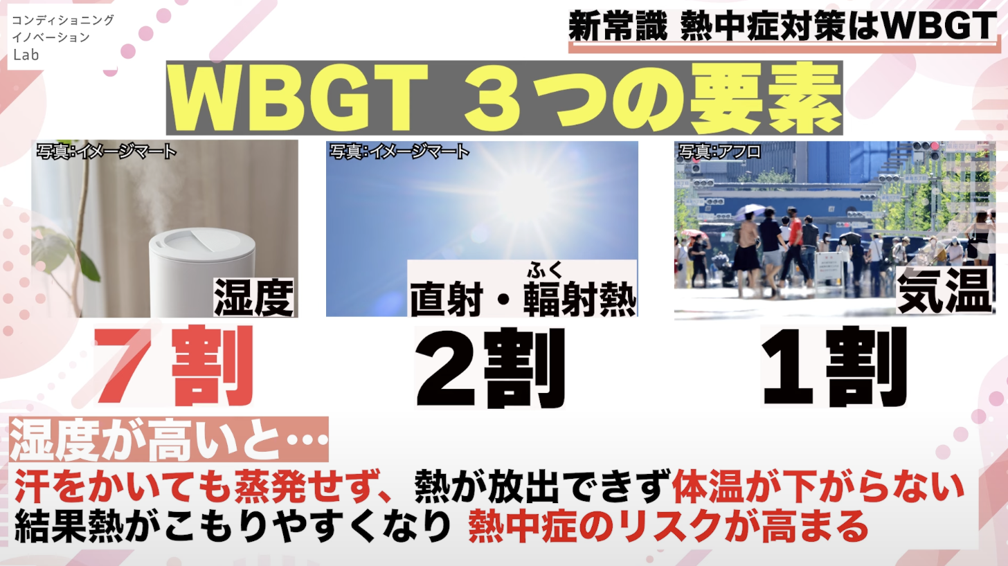 杉田さん)WBGTは「湿度」「直射・輻射熱」「気温」の3つの要素を加味した、人体にかかる熱ストレスを総合的に表した指標です。