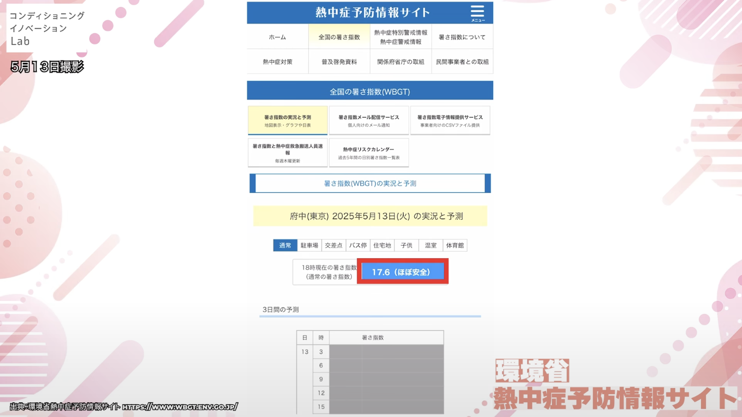 杉田さん)たとえば東京の府中のWBGTをみると、17.6ですね(撮影日:5月13日)。21未満だとほぼ安全という評価になります。