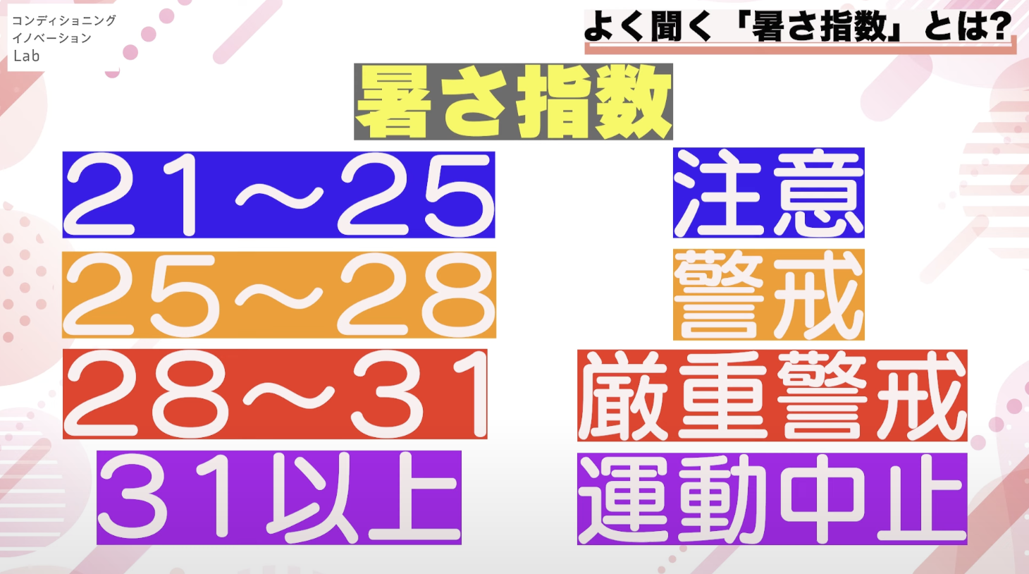 杉田さん)WBGTの数値は、21〜25までは「注意」で、熱中症による死亡事故が発生する可能性がある水準になります。25〜28は「警戒」。28〜31は「厳重警戒」。31以上だと運動は原則中止になります。