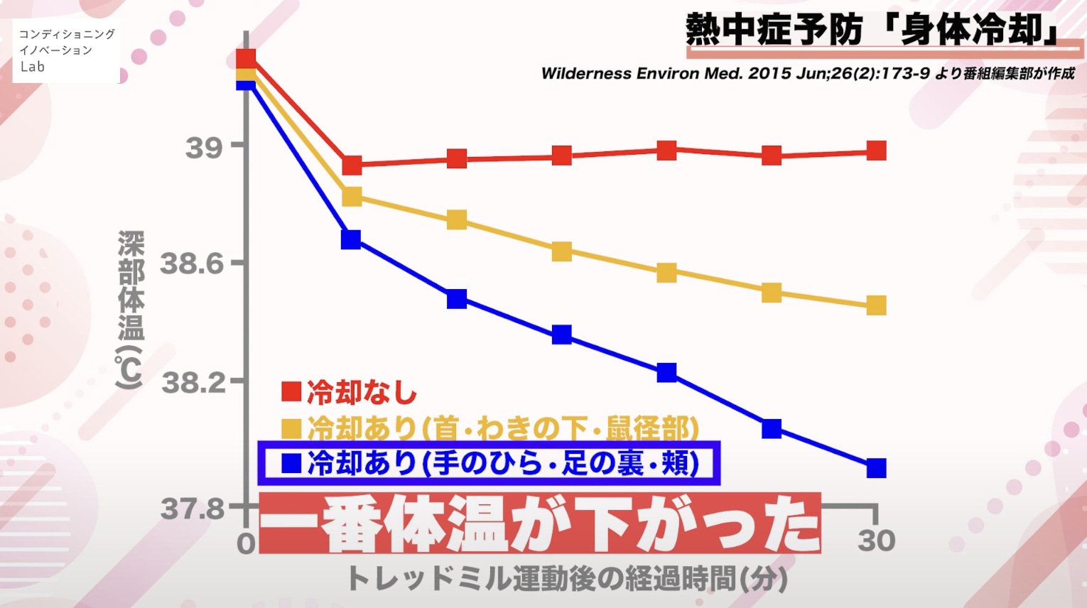 そうです。身体冷却について、運動して深部体温を39.2度まで上げたあとに「何もしない場合」「首・わきの下・鼠径部を冷やした場合」「手のひら・足の裏・頬を冷やした場合」で30分間の体温の低下具合を見た研究のデータがあります。