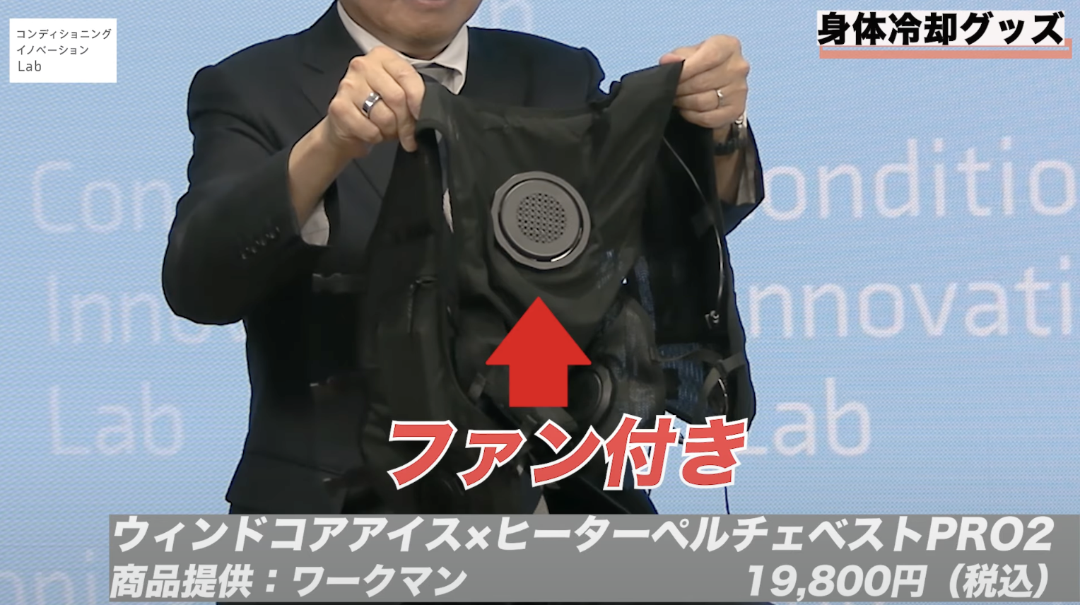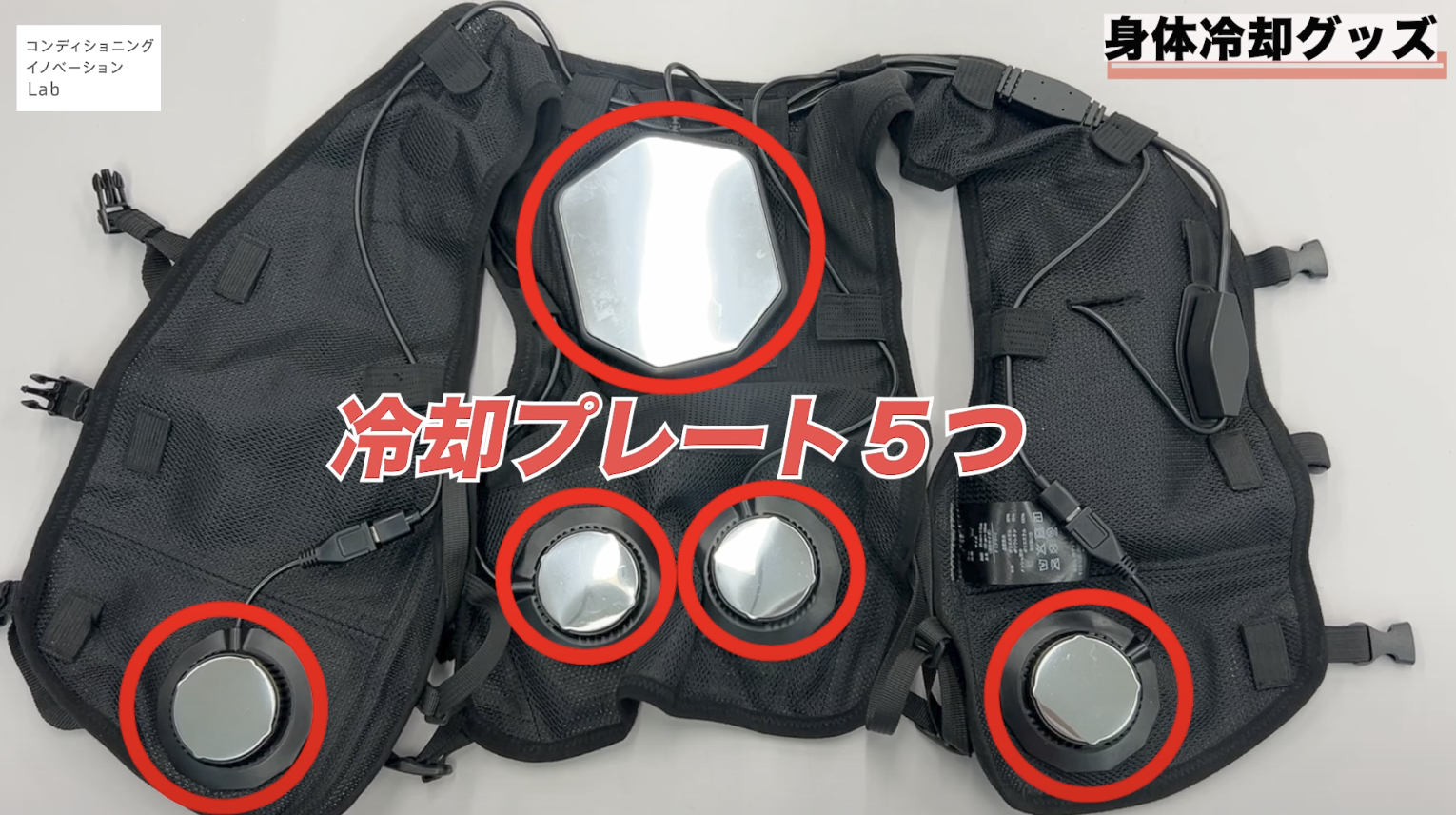 ファンが付いていて、体を冷やす冷却プレートも5つ付いています。「着る冷蔵庫」と言われているそうですよ。
