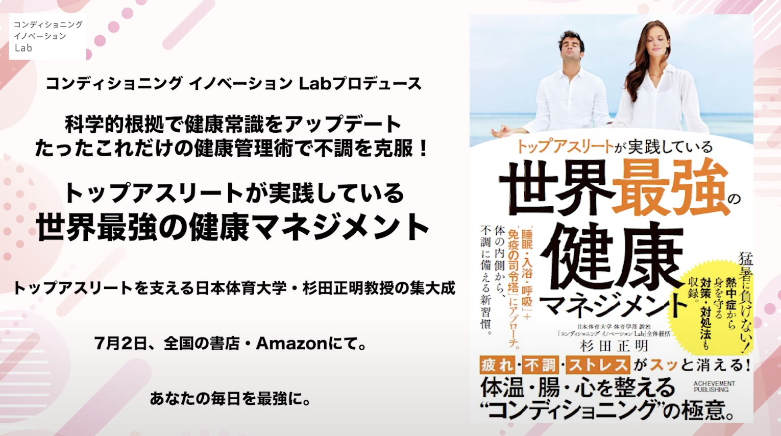 はい、ありがとうございます。トップアスリートのコンディショニングに関する知見を一般の方向けにわかりやすくまとめた本『トップアスリートが実践している世界最強の健康マネジメント』を、このたび出させていただくことになりました。