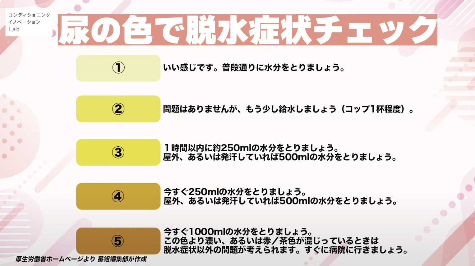 最近は学校のトイレに尿のカラーチャートが貼ってあって、「これで脱水の状態を確認しましょう」と呼びかけているところもあります。