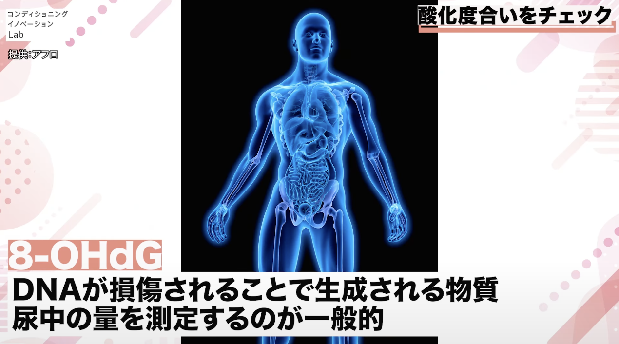 アスリートが朝起きたときの尿中8-OHdGを調べて、前日のトレーニングが多かったのか少なかったのか、疲労が溜まっていないかなどを判断する指標として使われています。