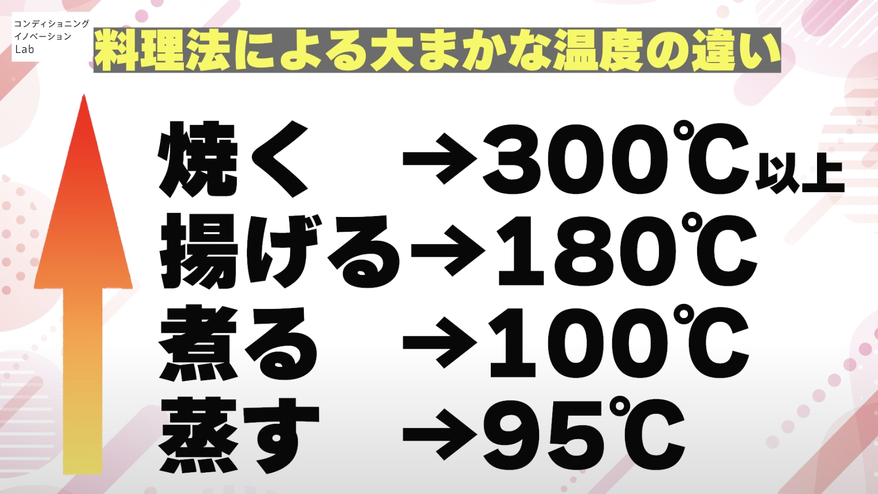 食材を蒸すと95℃程度、煮ると100℃程度、揚げると180℃程度、焼くと300℃以上になって、加熱調理温度が上がれば上がるほどAGEsも増えていきます。