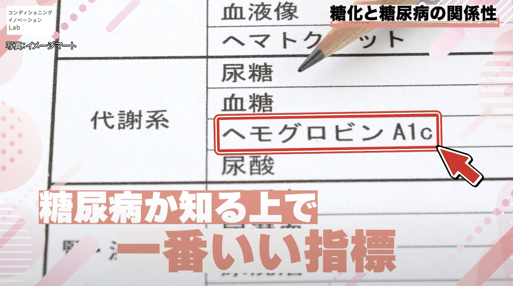 これは、血液中のヘモグロビンというタンパク質のうち何%が糖と結びついて糖化タンパクに変性しているかを示す数値です。健康診断でヘモグロビンA1cの値を測ると、自分が糖尿病なのかそうでないのかを知ることができます。