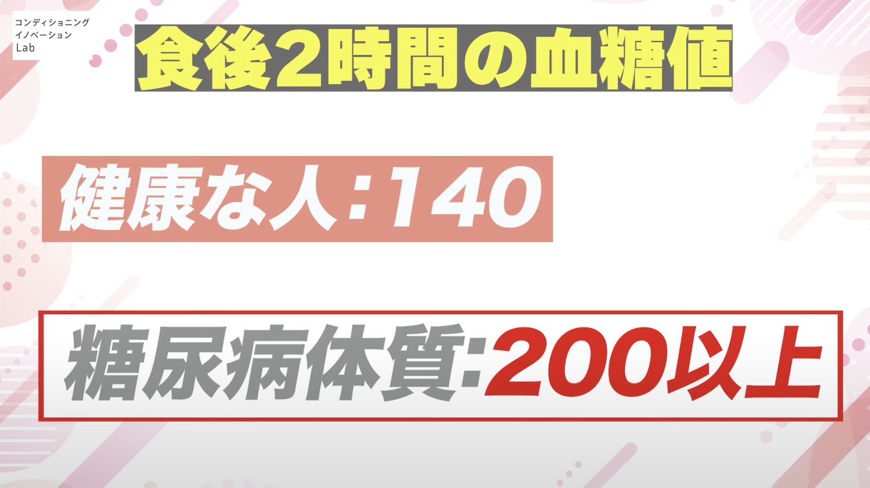 通常の血糖値は大体80〜100で、甘い物を食べると血糖値が急上昇します。健康な方なら食後2時間の血糖値は大体140ぐらいで収まるんですが、糖尿病体質の方は200、ひどい場合は300を超えることもあります。