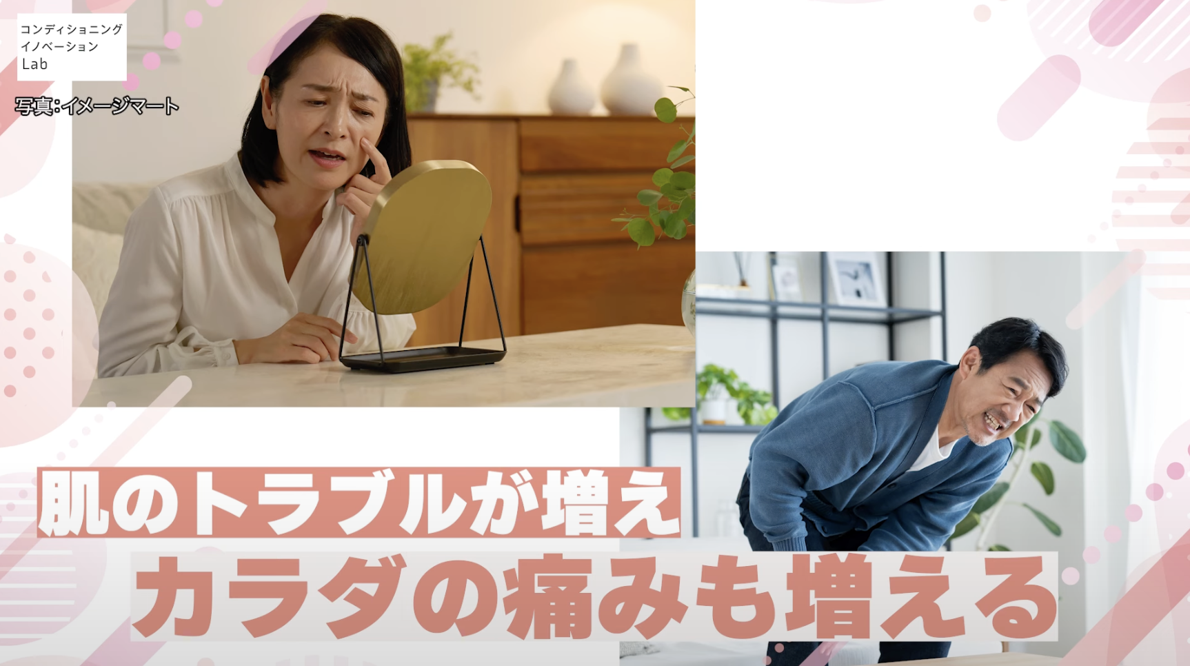 肌の張りがなくなったり、しわが増えたりと肌のトラブルが増えてしまいます。また、体が硬くなってきたり、体のあちこちが痛くなったりしますね。