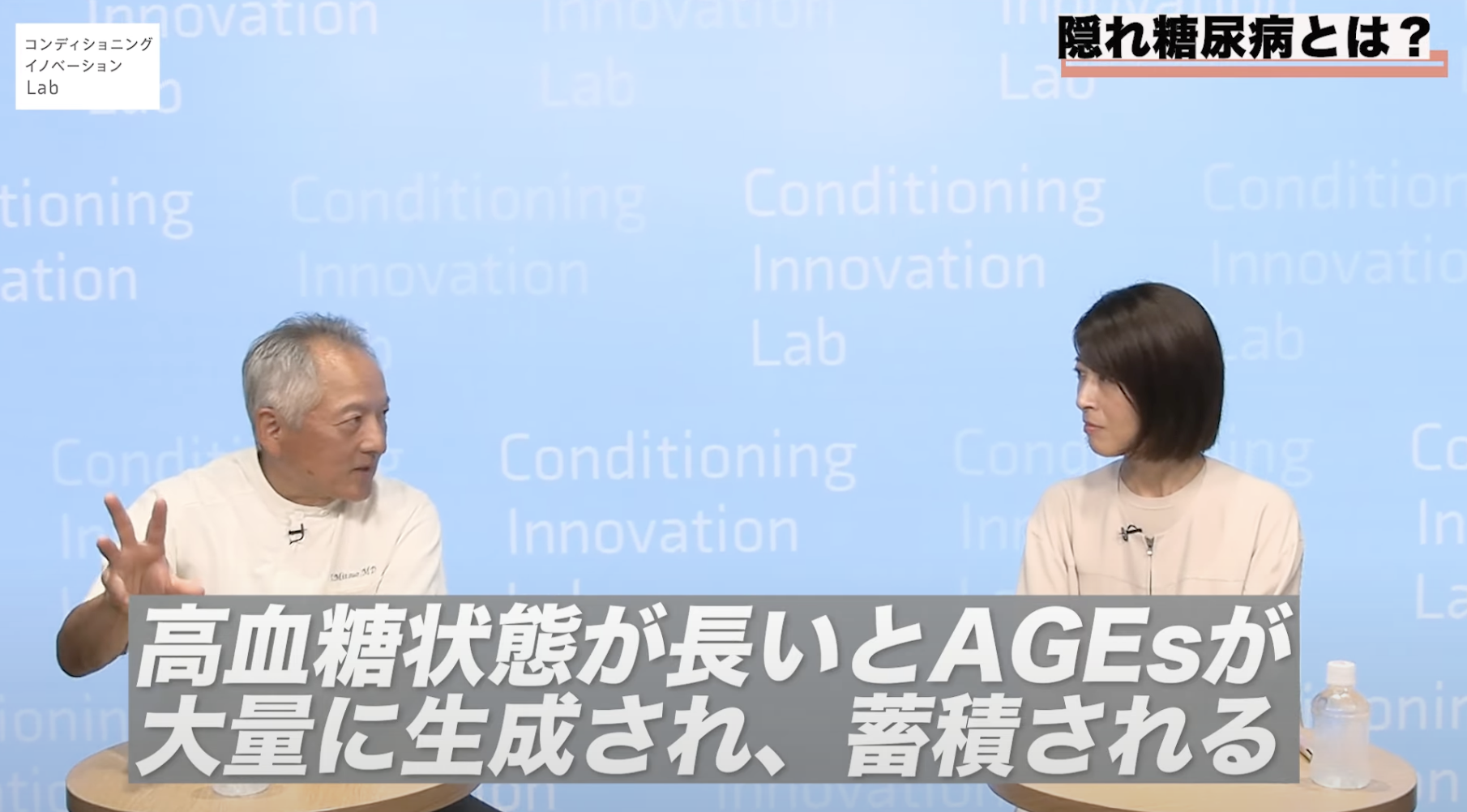 なぜ食後高血糖があると良くないかというと、今まで解説した糖化現象と関係しています。AGEsは血糖値とタンパクが結びついて生成されるので、高血糖の状態が長く続くとAGEsの量が増えてしまい、確実に糖尿病の世界に入っていくと考えられています。
