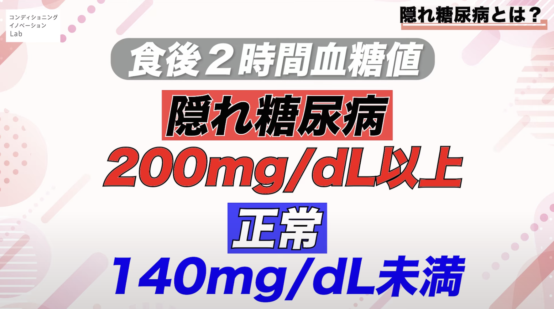 空腹時の血糖値は正常範囲であっても、食後に血糖値が急激に上昇して高血糖になる状態を指します。健康な人なら、食後2時間の血糖値は140mg/dL未満に収まるんですが、隠れ糖尿病の人は200mg/dL以上になっている場合があります。