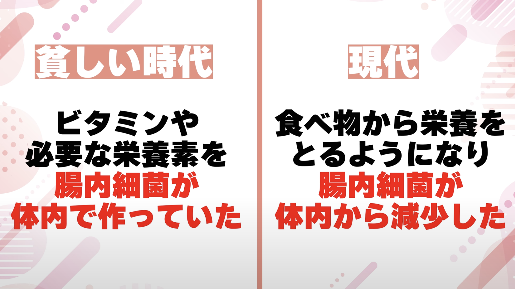 私たち人間は、食べる物が貧しい時代を生き延びてきたときに、腸内細菌の力を借りてビタミンをつくってもらったり栄養素をつくってもらったりしていたわけです。