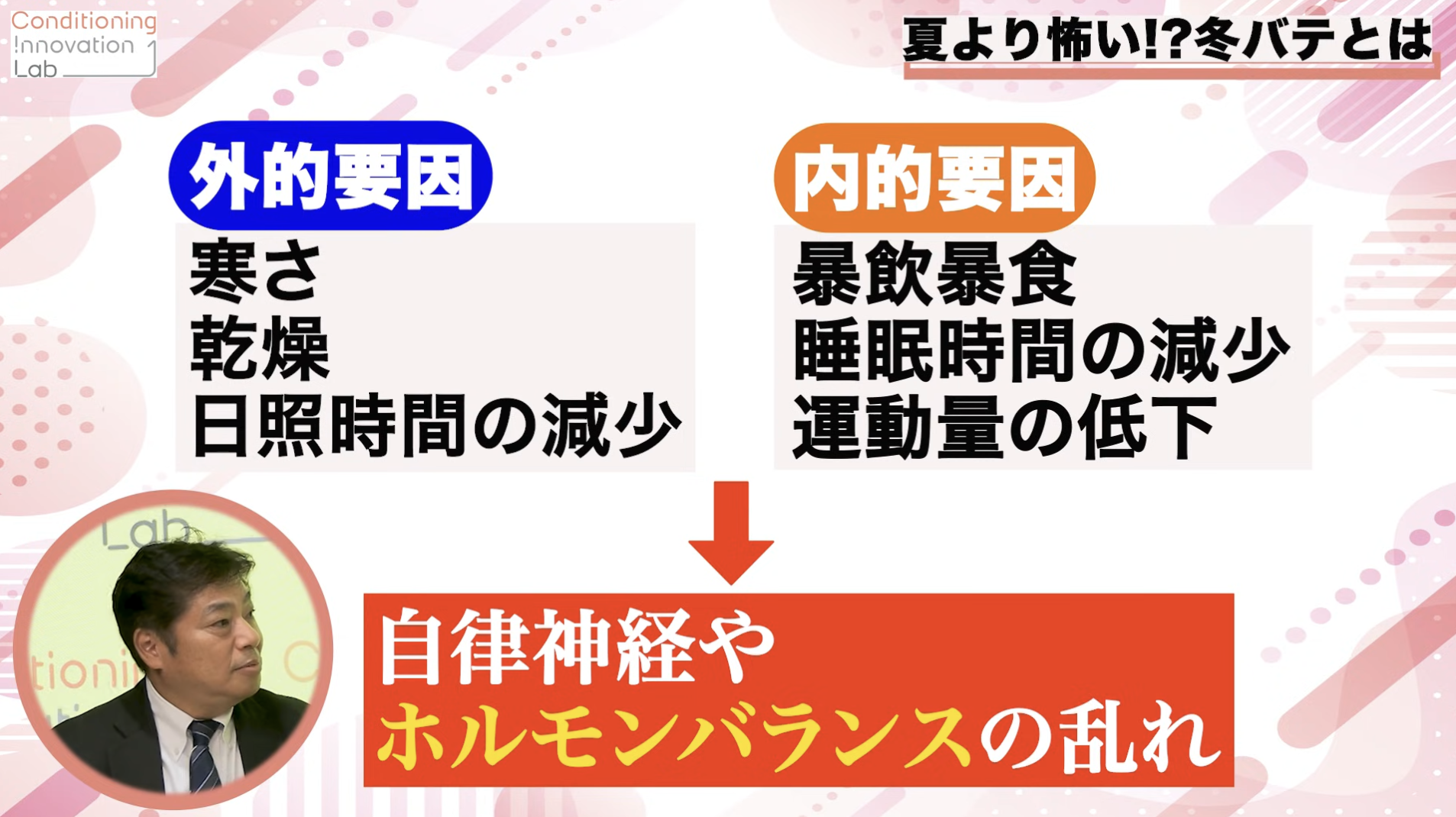 杉田さん)寒さや乾燥といった「外的要因」と、年末年始の暴飲暴食や睡眠時間の減少などの内的要因が重なった結果、自律神経やホルモンのバランスが乱れる状態。これが「冬バテ」です。かっこ良く言えば「複合的なストレス状態」と定義づけできると思います。