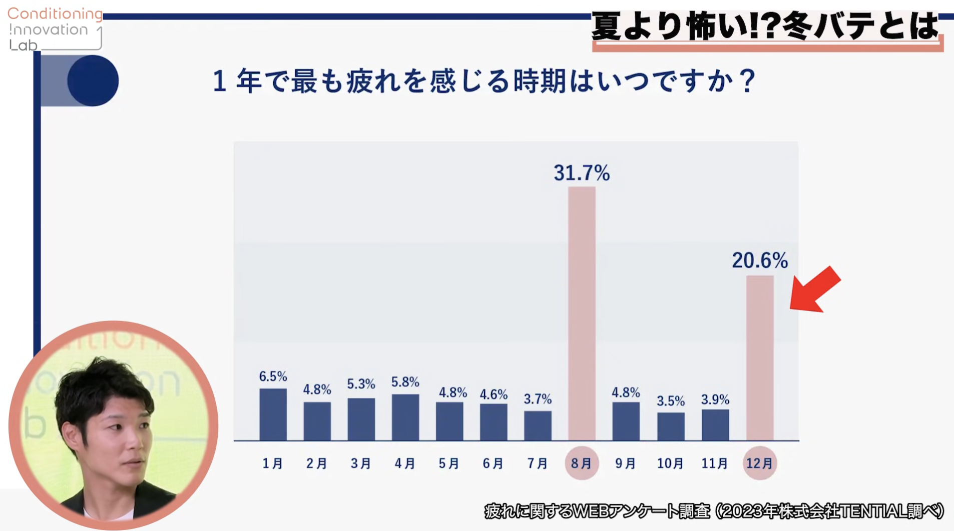 舟山さん)1年間のどのタイミングで一番疲れを感じやすいか調査したことがあるんですが、アンケート回答でもっとも多かったのが一番暑くて夏バテをする「8月」で、その次が「12月」でした。