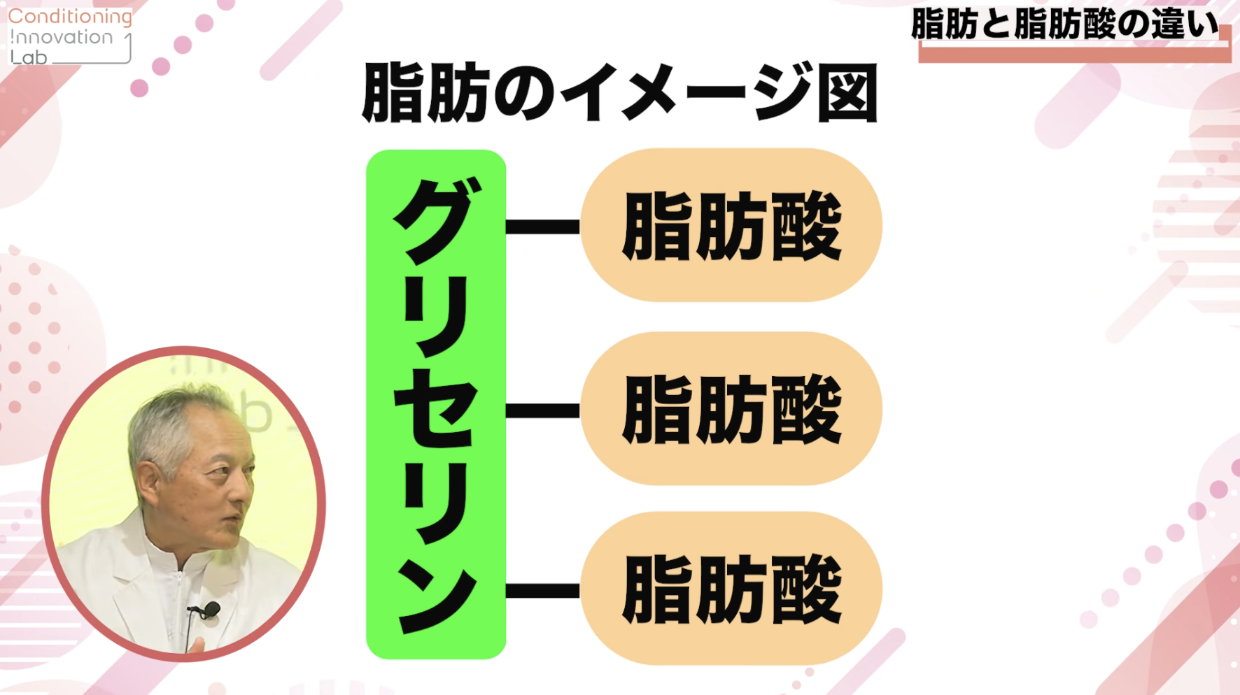 脂肪酸は、脂肪という大きな塊を作るためのパーツに当たります。「グリセリン」という脂肪酸をつなぎとめておくパーツがあるんですが、そのグリセリンと脂肪酸が3カ所で繋がったものを総称して脂肪と呼びます。