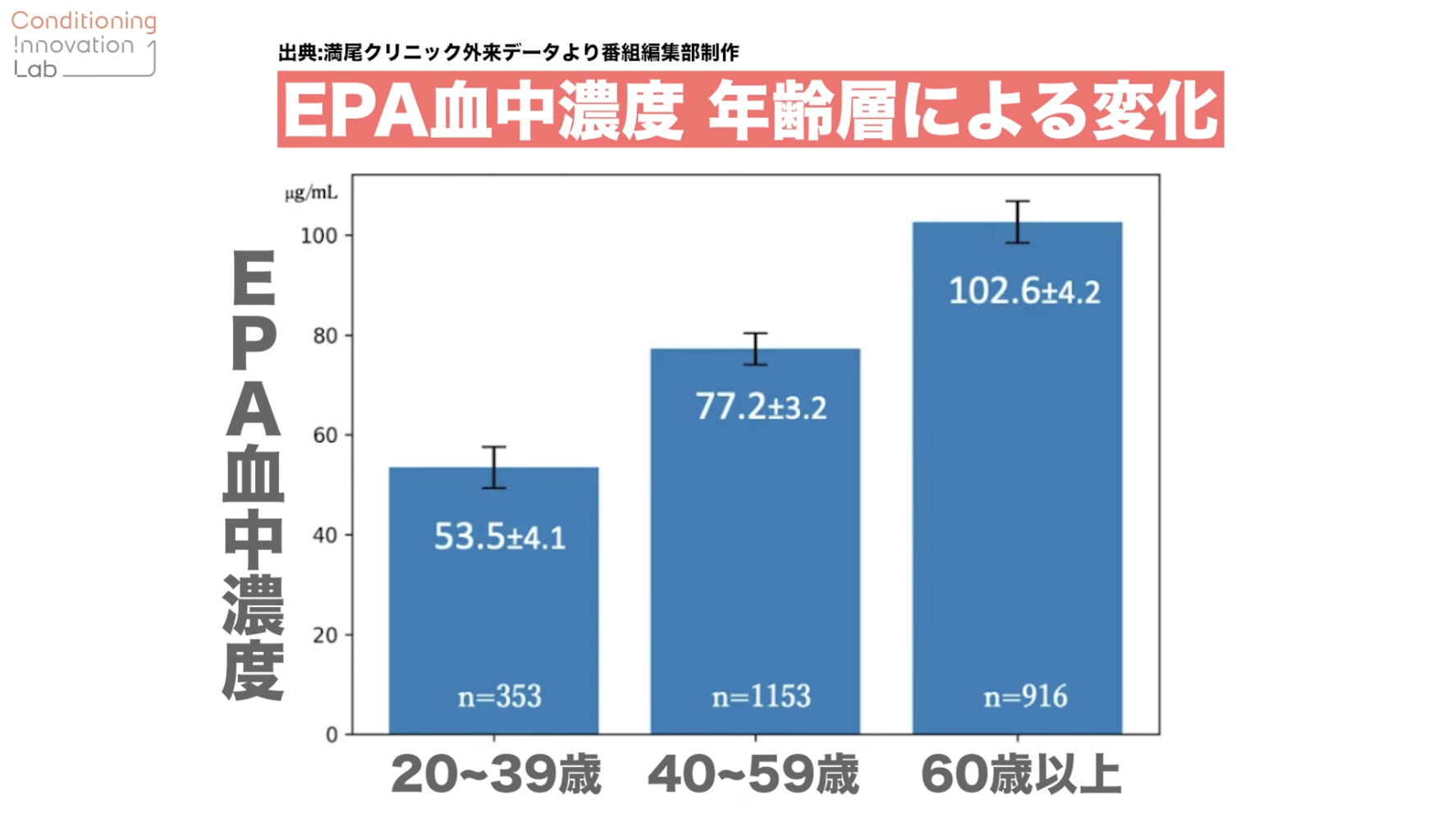 データを見ると年代別にはっきり差が出ています。20代・30代の方と60代以降の方を比較すると、EPA(オメガ3脂肪酸の一種)の血液中の濃度が、若い方は高齢者の半分しかないんです。