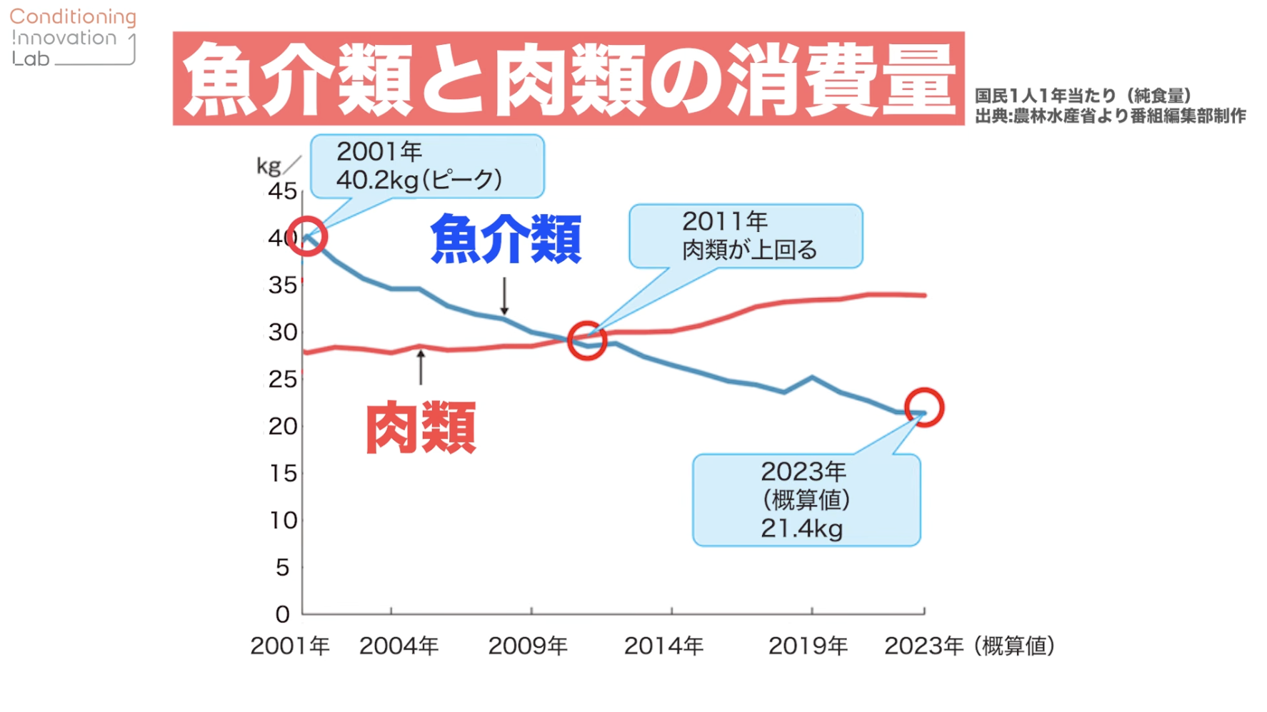 おっしゃるとおりです。日本全体で魚の摂取量が減ってきていて、反対に肉類の摂取量が増えているんですね。農林水産省のデータでは、2011年ごろに魚介類よりも肉類の摂取量が増えてしまったと言われています。