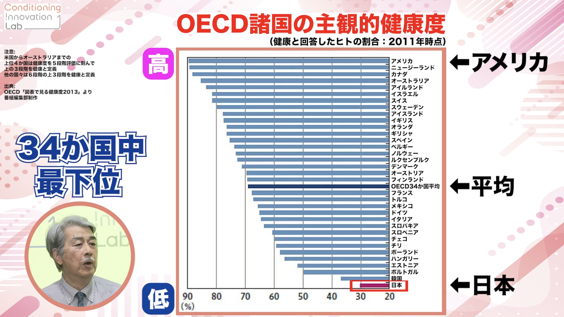 そうですね。主観的な健康度についていうと、OECDのなかでは日本が一番悪くて、たぶん世界的にもどん底です。